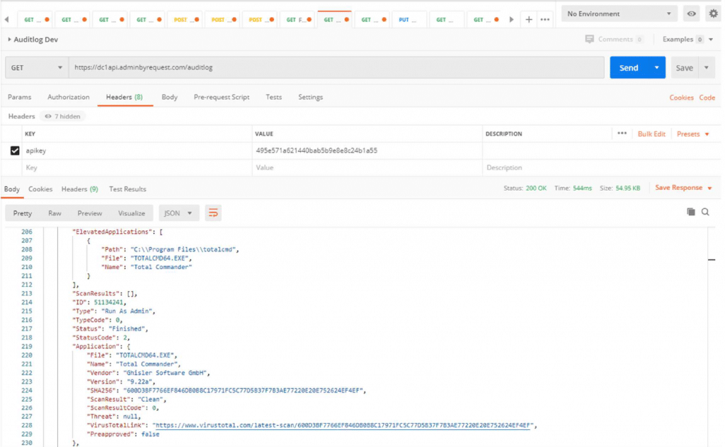 Once we have this key, we can make a call to the API using the API key as the “apikey” header. We will be using the free Postman (https://www.postman.com/) to demonstrate the use. Here we have called the Auditlog API to get entries: